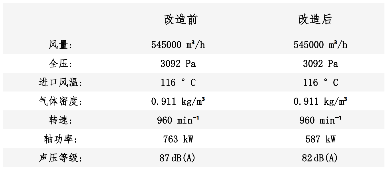 在項(xiàng)目低投入下,客戶成功完成了風(fēng)機(jī)的改造升級(jí),能耗大幅降低23%,噪音降低5.8%,實(shí)現(xiàn)了低成本,高效益的既定改造目標(biāo)。風(fēng)機(jī)改造前后的參數(shù)如下: