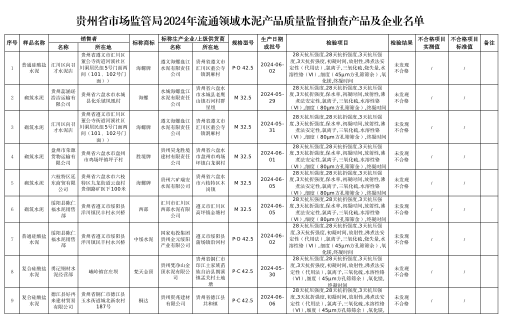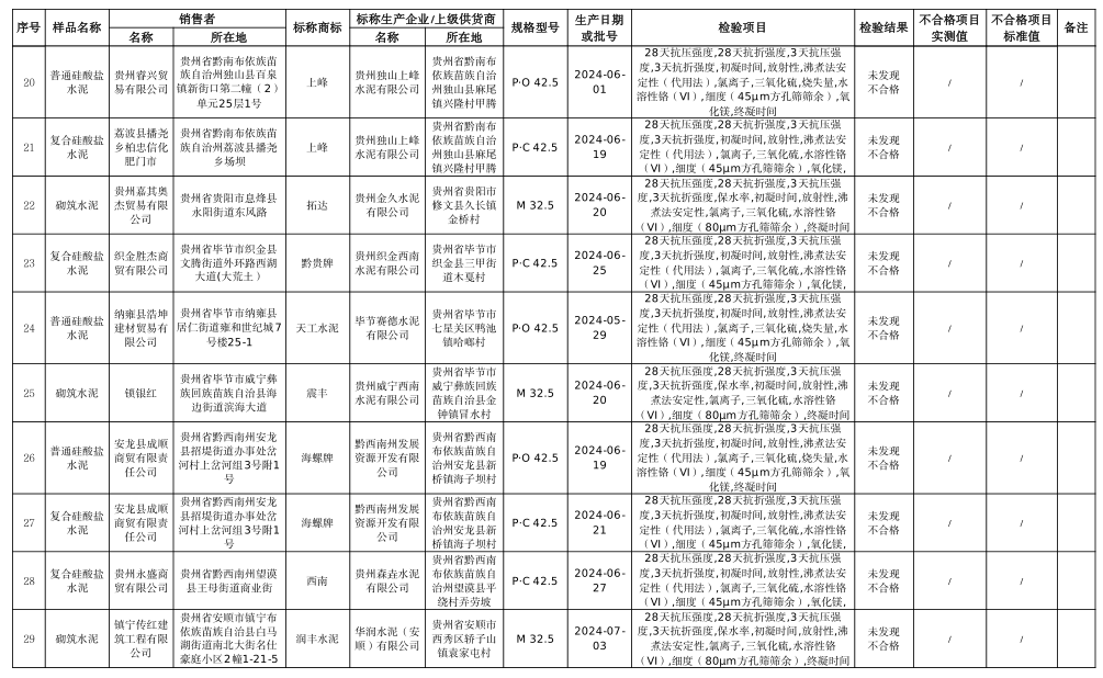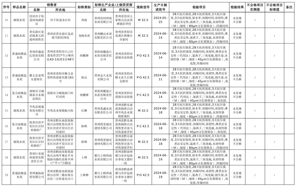 本次共對(duì)26家銷(xiāo)售者銷(xiāo)售的30批次水泥產(chǎn)品開(kāi)展了監(jiān)督抽查,,抽查區(qū)域?yàn)橘F陽(yáng)市、遵義市、六盤(pán)水市、安順市、畢節(jié)市、銅仁市、黔東南州、黔南州、黔西南州。本次監(jiān)督抽查依據(jù)GB 175-2023《通用硅酸鹽水泥》等標(biāo)準(zhǔn)進(jìn)行檢驗(yàn)。經(jīng)檢驗(yàn),未發(fā)現(xiàn)不合格產(chǎn)品。水泥人網(wǎng)注意到上述抽查的30批次水泥全部來(lái)自于流通領(lǐng)域。涉及水泥品牌包含海螺、西南、紅獅、潤(rùn)豐、臺(tái)泥、堯柏、上峰、西部等。抽查水泥品種為普通硅酸鹽水泥、復(fù)合硅酸鹽水泥、砌筑水泥三類(lèi),其中P.C和P.O水泥抽查標(biāo)號(hào)為42.5.砌筑水泥抽查標(biāo)號(hào)為32.5.