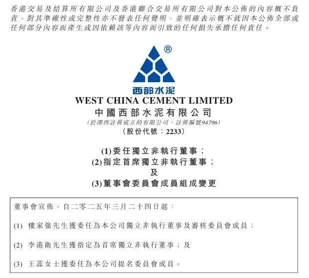 3月24日,西部水泥發(fā)布公告。樓家強(qiáng)獲委任為公司獨(dú)立非執(zhí)行董事及審核委員會(huì)成員,李港衛(wèi)獲指定為首席獨(dú)立非執(zhí)行董事,王蕊獲委任為公司提名委員會(huì)成員。