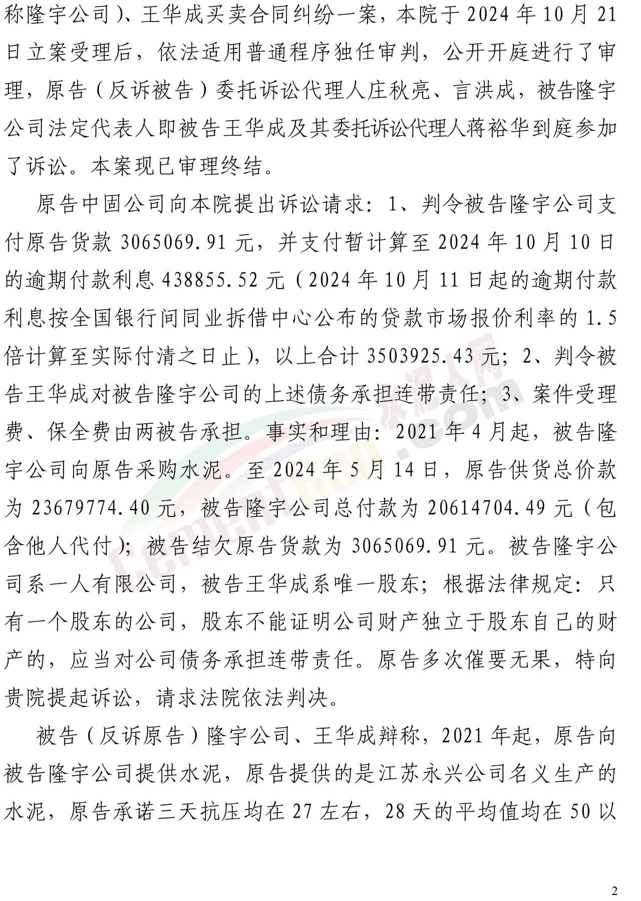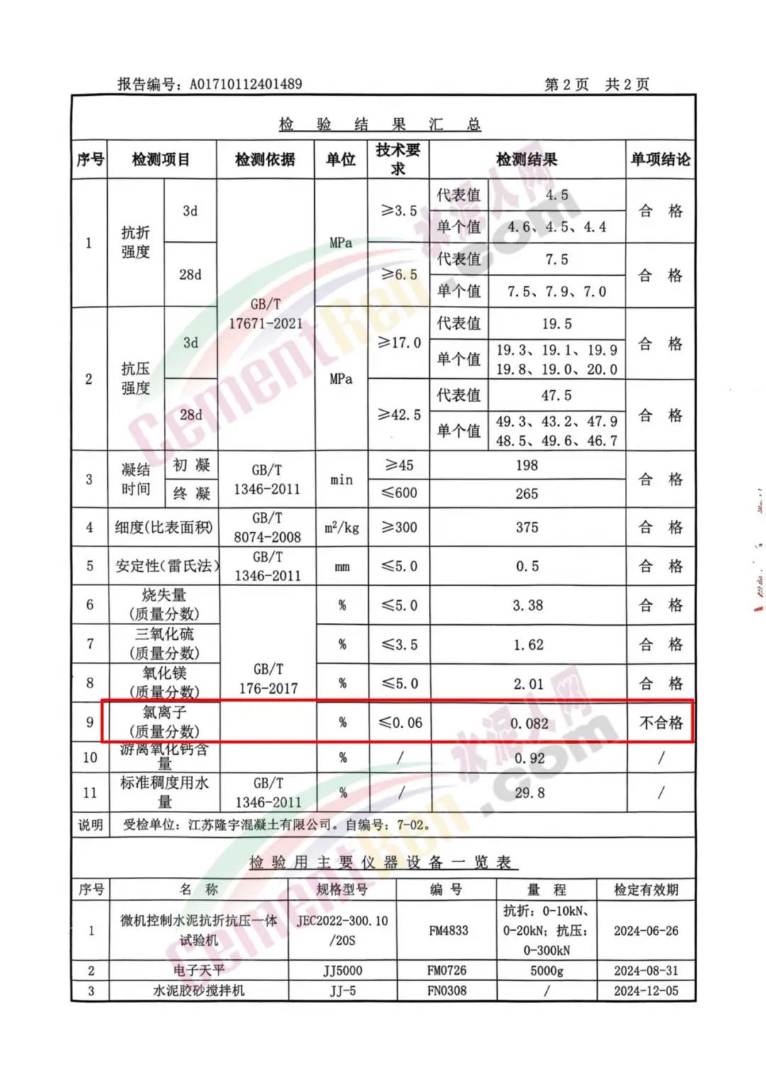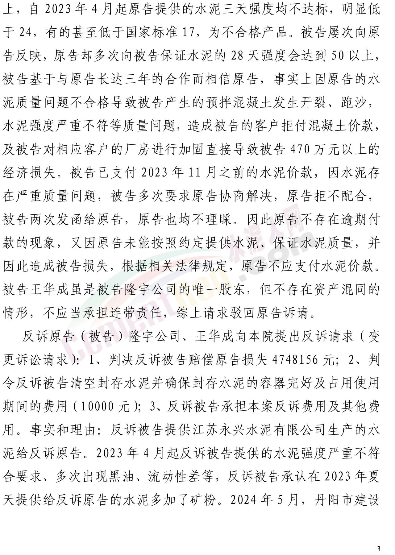 隆宇公司則提起反訴,堅(jiān)稱中固公司供應(yīng)的水泥存在嚴(yán)重質(zhì)量問題(氯離子超標(biāo)、強(qiáng)度不足),并提供了自己委托江蘇省建筑工程質(zhì)量檢測(cè)中心有限公司于2024年12月12日出具的檢測(cè)報(bào)告作為核心證據(jù)。然而,這份報(bào)告成為其敗訴的關(guān)鍵伏筆。