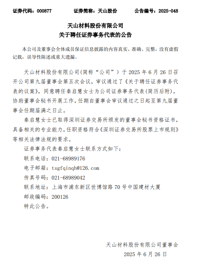 天山股份6月26日晚間發(fā)布公告稱,公司審議通過了《關(guān)于聘任證券事務(wù)代表的議案》,同意聘任秦啟慧女士為公司證券事務(wù)代表,協(xié)助董事會秘書開展工作。