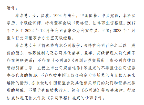 其簡歷顯示:秦啟慧,女,漢族,1994年出生,中國國籍,中共黨員,本科雙學(xué)歷,中級經(jīng)濟(jì)師,持有董事會秘書資格證、法律職業(yè)資格證。2017年7月至2022年12月任公司董事會辦公室專員、主管;2023年1月至今任公司董事會辦公室高級經(jīng)理。