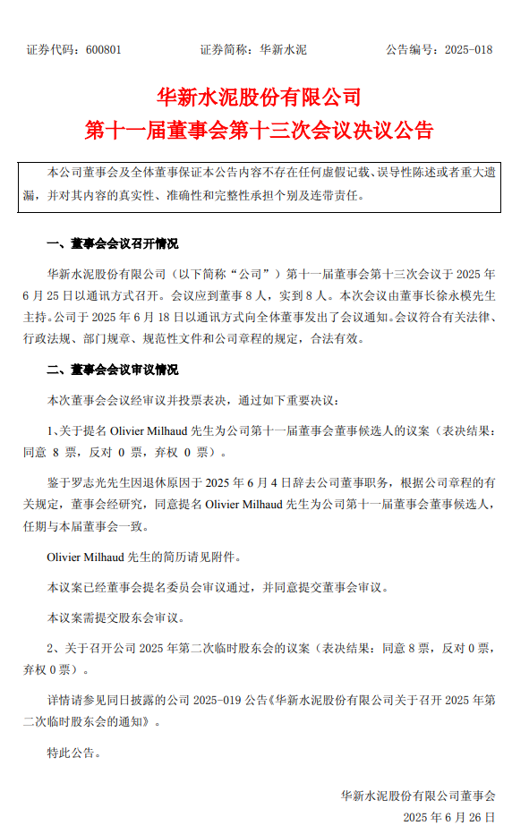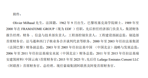 6月25日,華新水泥發(fā)布公告稱,經(jīng)公司董事會會議審議并投票表決,選舉Olivier Milhaud為公司第十一屆董事會董事,任期與本屆董事會一致。根據(jù)公告,Olivier Milhaud,法國籍,1962年9月出生,巴黎埃塞克商學(xué)院碩士。
