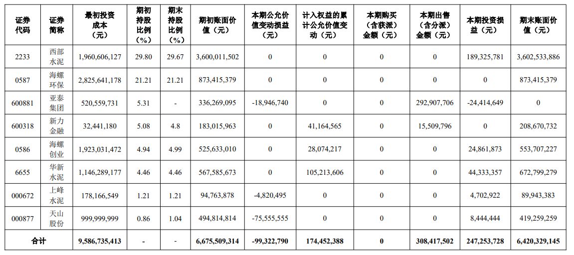 水泥人網(wǎng)注意到,海螺水泥2024年度報告中披露,海螺水泥除持有西部水泥股份外,還持有亞泰集團、華新水泥、上峰水泥、天山股份等企業(yè)股份,西部水泥為其持股比例最大的同行企業(yè)。