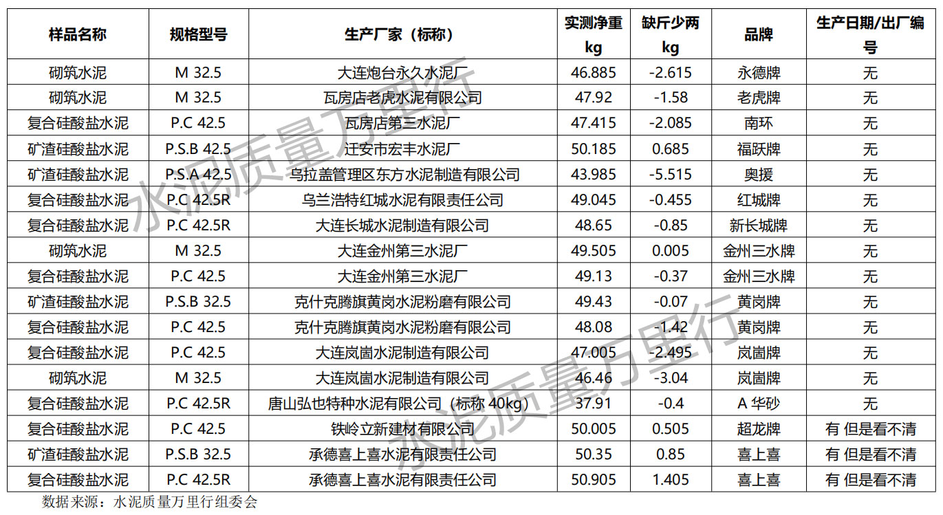近日,水泥質(zhì)量萬里行組委會發(fā)布泛東北地區(qū)流通領(lǐng)域水泥抽檢新結(jié)果。在已完成的80批次抽檢中,袋重不足問題突出,同時近四分之一產(chǎn)品存在質(zhì)量不達(dá)標(biāo)情況,部分企業(yè)還涉嫌資質(zhì)與商標(biāo)違規(guī)。